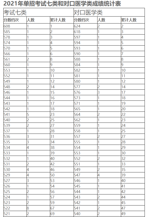 2021年河北省年高职单招考试七类和对口医学类成绩统计表