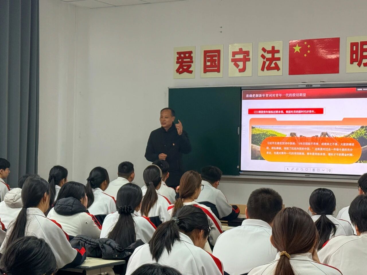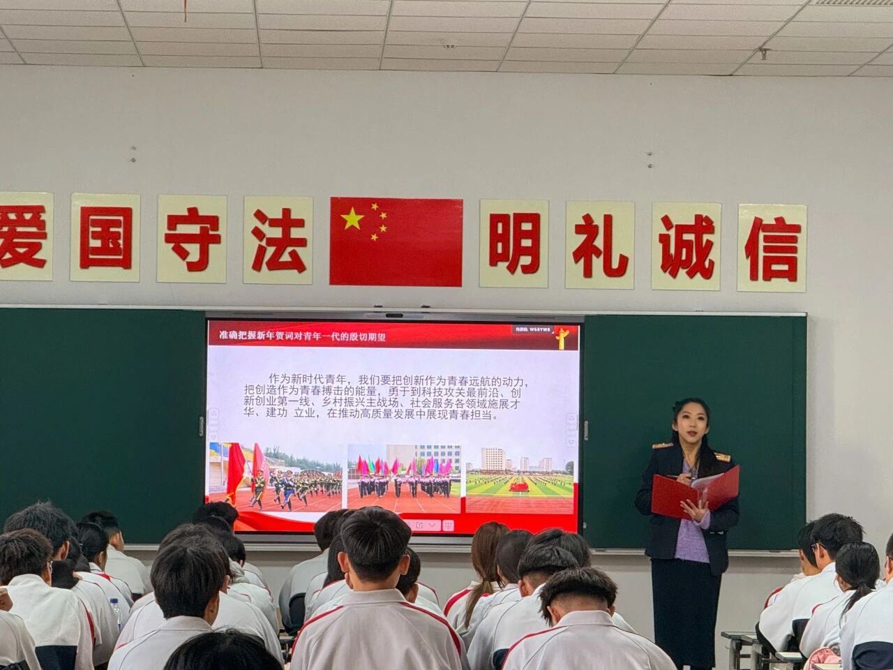 团课围绕贺词的重要意义、核心内涵、指导作用、价值追求及实践路径五大板块深入展开讲解,系统阐释了贺词中蕴含的高瞻远瞩的战略考量与殷切深情的嘱托。习近平总书记的贺词,既为国家发展锚定了目标,又对志愿服务、科技创新、青年成长、国际合作等诸多领域提出了明确要求,为新时代青年成长成才指明了前进方向。在交流研讨环节,同学们围绕“如何将专业所学与贺词精神相结合,以青春之力赋能技能强国”展开深入探讨。同学们结合专业学习与人生规划踊跃发言,畅谈学习感悟。大家一致认为,身为中职学子,既要胸怀“国之大者”,紧跟国家发展大势,又要立足专业领域,筑牢技术根基,全力提升创新与实践能力,为实现高水平科技自立自强目标奉献青春智慧。