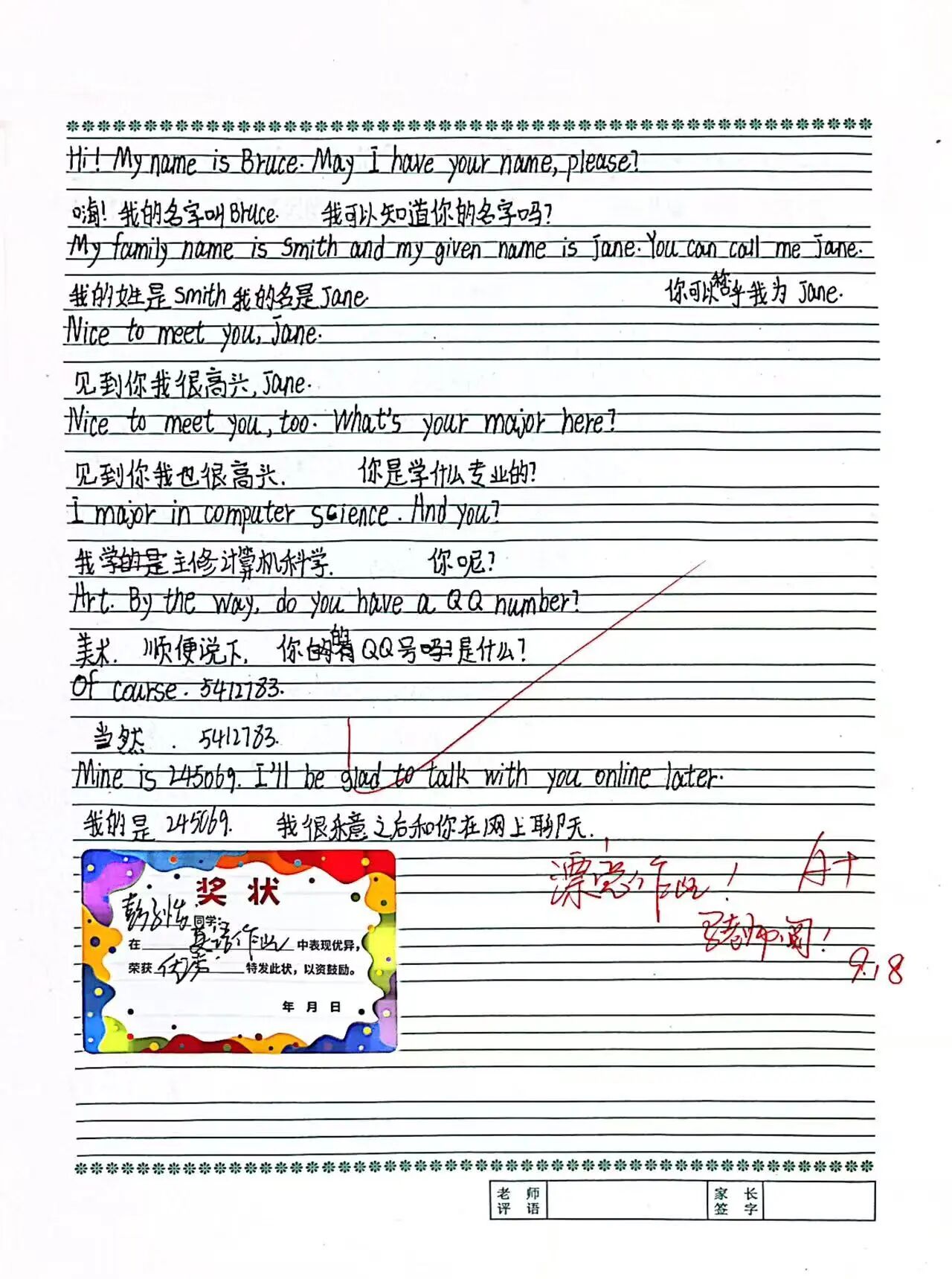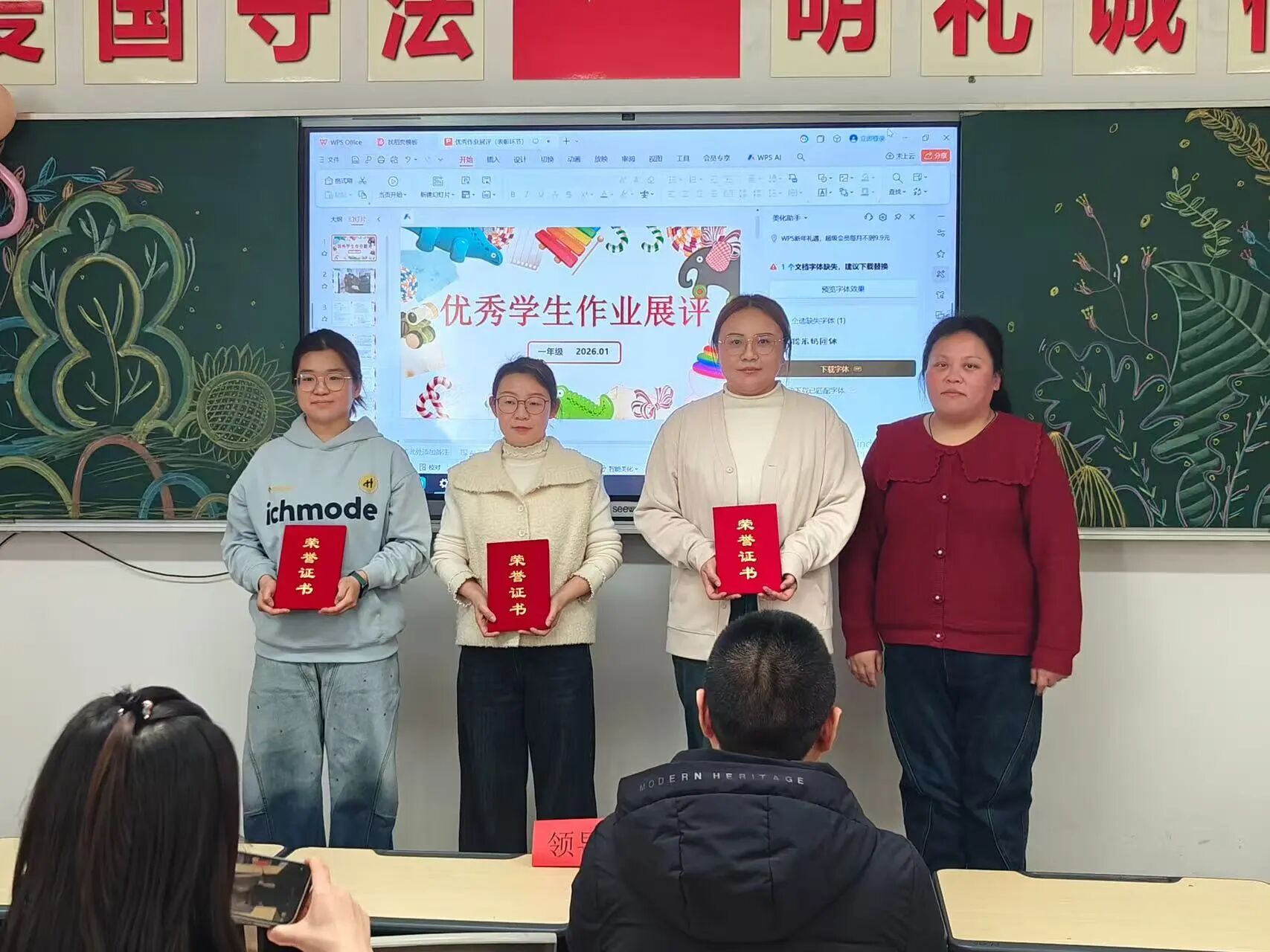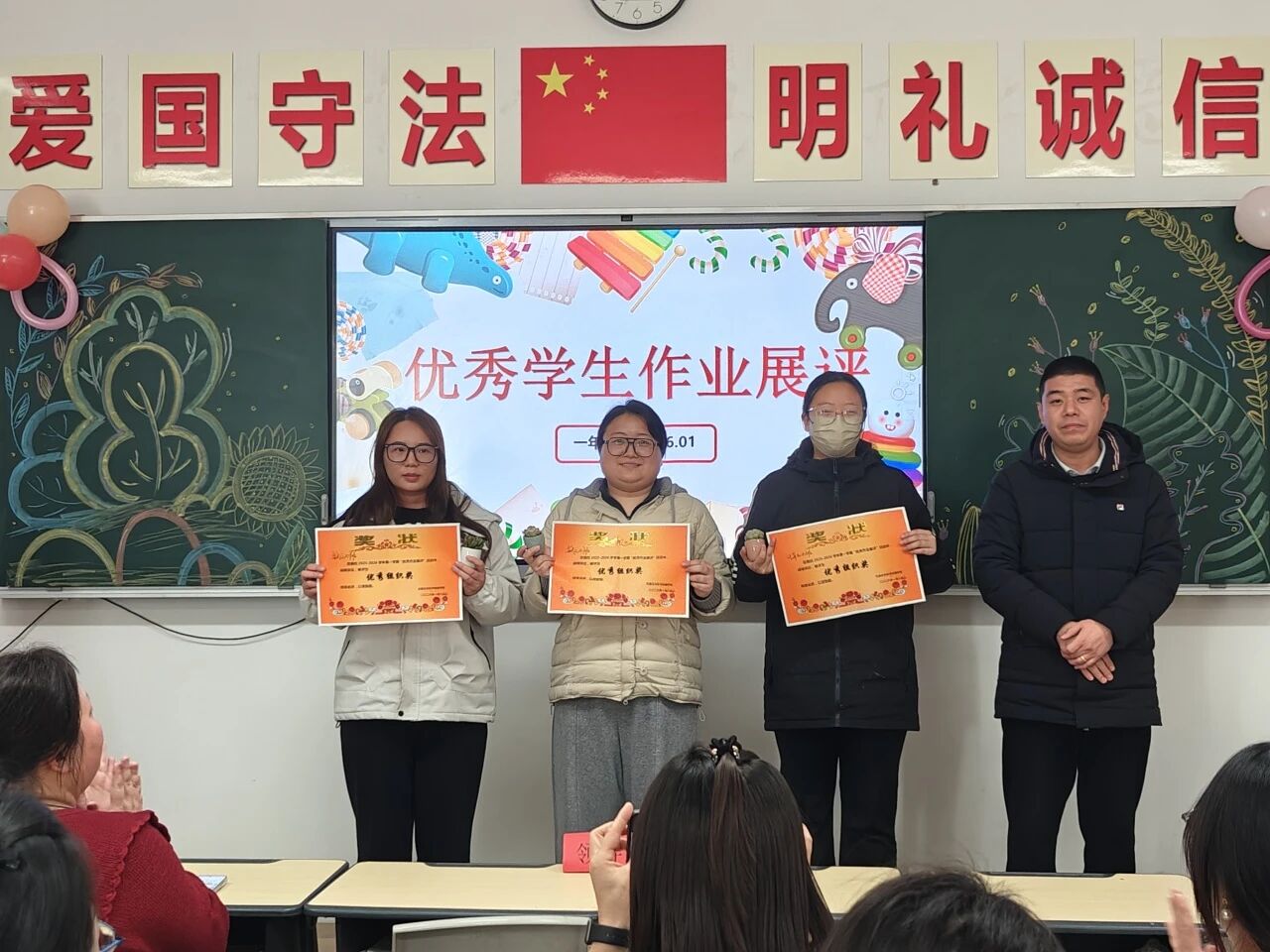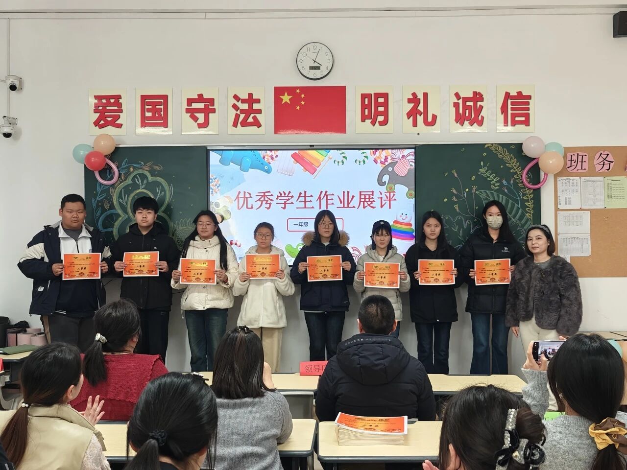 1月9日下午,活动迎来高潮时刻——评选表彰大会。教务处副处长李海燕、一年级教学副主任廖幽兰、一年级管理副主任薛星,以及各班班主任、任课教师与获奖学子齐聚一堂,共同见证荣耀时刻。大屏幕上,优秀作业的精彩片段与活动精彩瞬间一一呈现:汉字横平竖直间,是学子对书写的敬畏;数学解题步骤里,是逻辑思维的闪光;红笔圈点批注中,是师者的悉心指导。温暖的鼓励评语、细致的思路点拨,既是对学子进步的肯定,更是匠心育人的生动诠释。